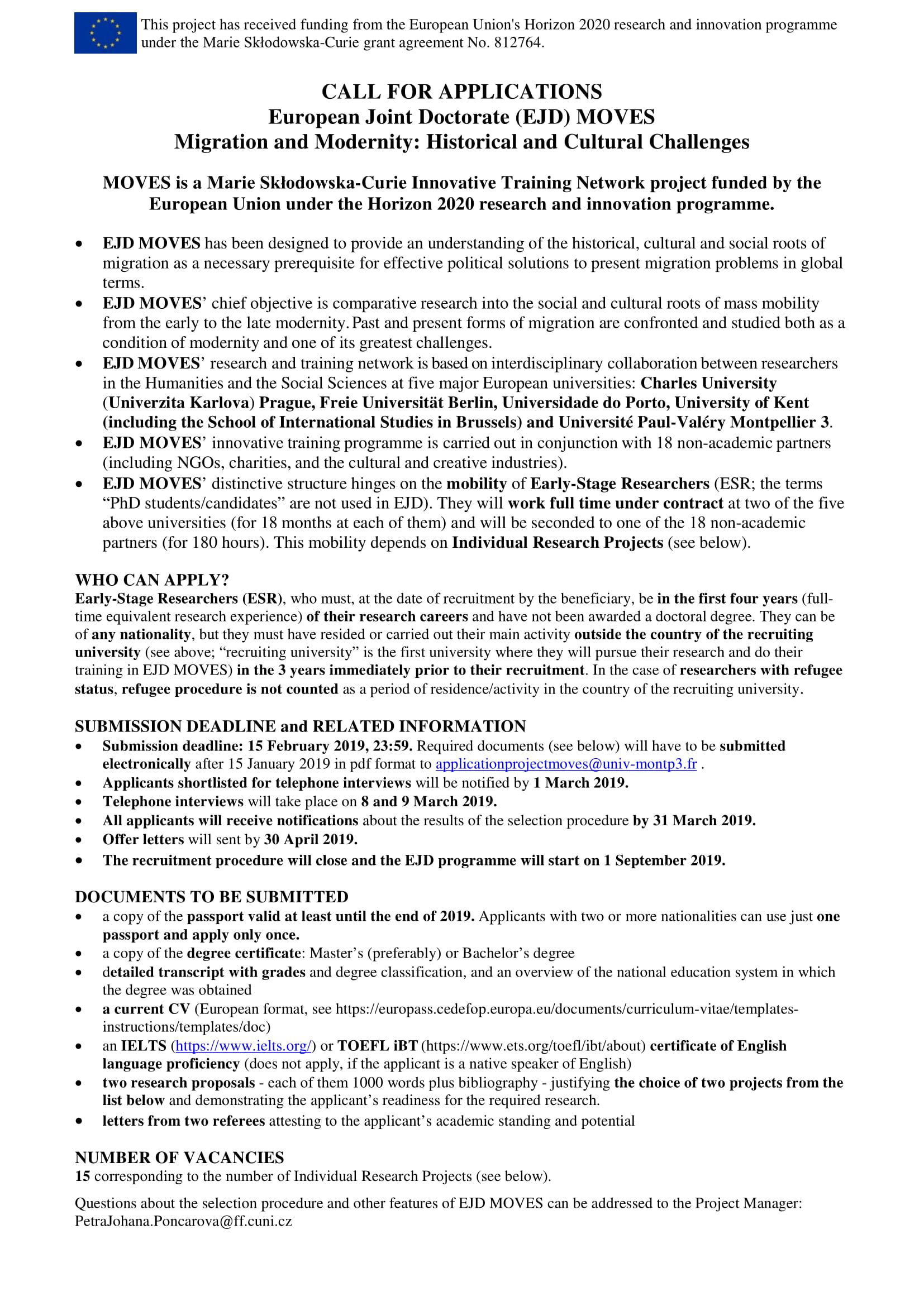 Call for Applications: Migration and Modernity: Historical and Cultural Challenges 28.11.2018 Posted In CFP 0 comment(s) November 28‘18 Ciaran European Joint Doctorate (EJD) MOVES